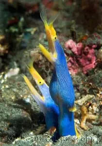 This amazing eels get their name “ribbon eel” from the thin ribbon-like dorsal markings and their ribbon like swimming patterns. usually you will find only only the head of a blue ribbon eel, but if you’re lucking enough to view a blue ribbon eel actually “free swimming” you will quickly realize where they get the name “ribbon eel”.
