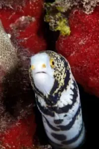 A Zebra Moray Eel is a stunning and extremely relaxed and docile species of saltwater eel for sale. Zebra moray eels for sale get their name from the bold pattern of bars on their bodies.